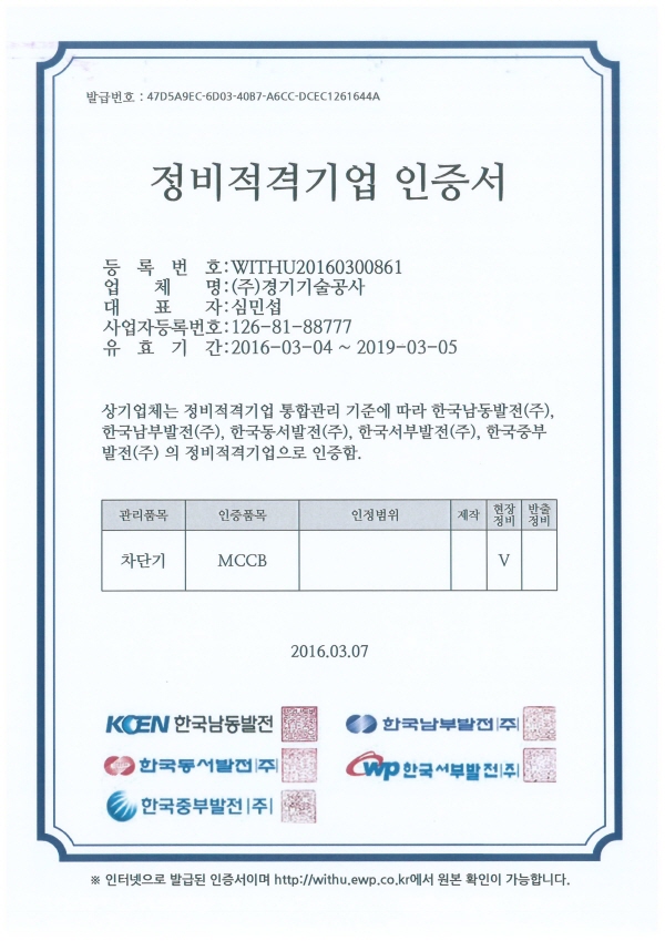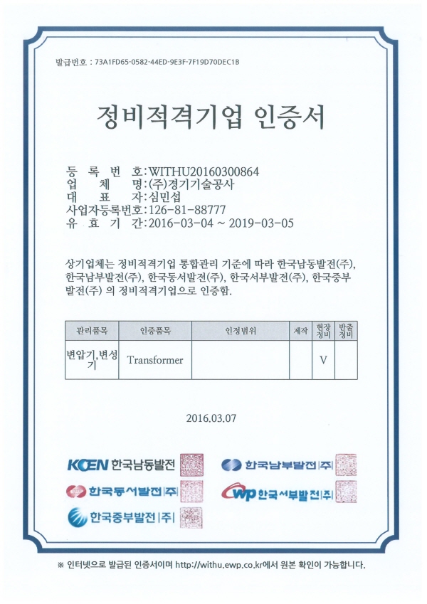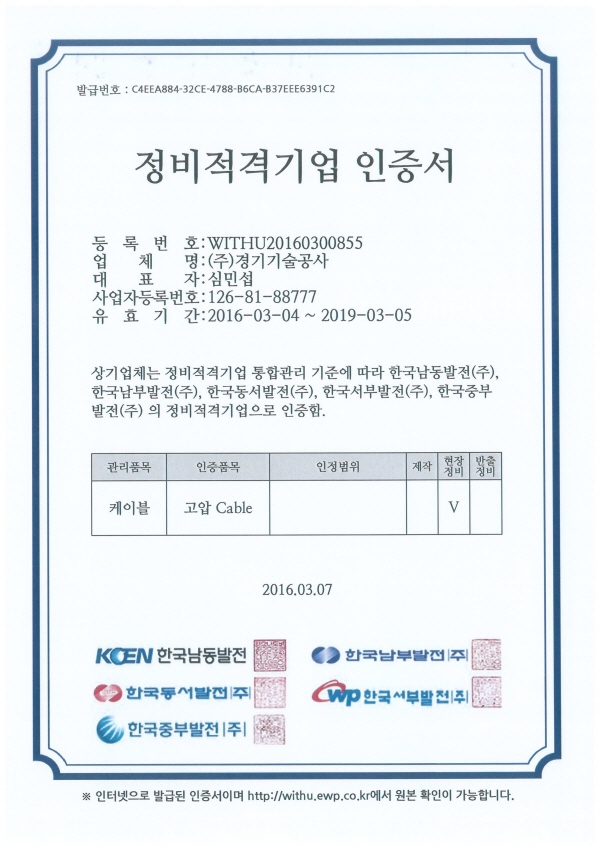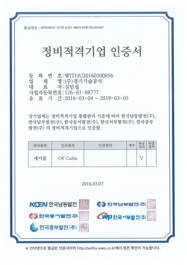HOME > 인증서 > 인증서