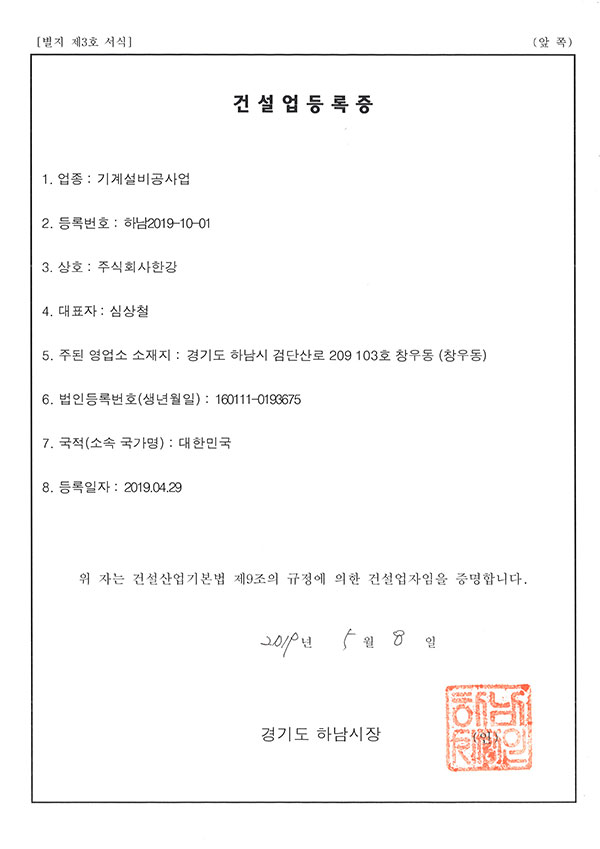 건설업등록증(기계설비)